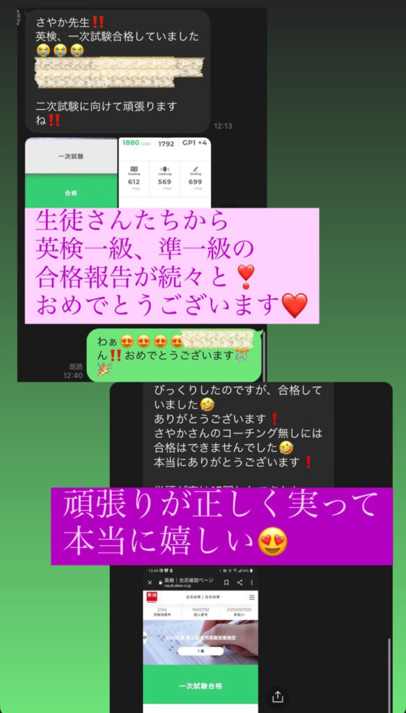 過去問の長文問題が全然読めず、日本語訳を読んでも理解ができなくて、跳び箱にしたら、8段くらいのがそびえたってる感じでした。 でもコーチにゴールへの道筋をたててもらいましたので、セッションを道しるべとして、次のセッションまでにこれだけやればいいということで、勉強しやすかったです。分からない単語が一問に20個くらいあっても、内容がわかるようになりました。受験直前は、跳び箱8段が2段くらいに感じました。1月に受けたTOEICでリスニングが、一年前385点→490点に上がりました。英検の勉強をしたことで、TOEICの点数も自然に上がっていました。 コーチングを受けてみての感想は、マラソンに例えさせてください。ながーいマラソンでも、例えば、あの木までどのくらいのタイムで走ってみてという感じで、伴走してくださってる感じでした。そして、負担にならない絶妙なタイミングで小出しにわたしのやり方を変化させるアドバイスをくださいました。あとは、わたしの合格を強く信じてくださったことです!!私自身よりも(笑)すごく愛や応援を感じることができて、それでがんばれたんだなって思います。本当にありがとうございました!!!!!今後ともどうぞよろしくお願いいたします。 近い目標は、全国通訳案内士合格です。
