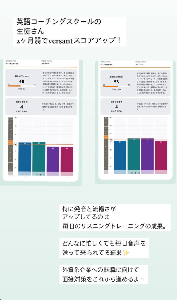 コーチングを受けてみての感想ですが、ライティングとスピーキングは1人での勉強は厳しいと思います。書いたエッセイを採点してもらい、自分がよくしがちなミスがわかり、丁寧に解説もしていただけてありがたかったです。スピーキングも本番の面接のように練習ができてよかったです。 ささいな疑問もLINEで気軽に聞けて、すぐ解決できたのも勉強が効率よく進んだ一因だと思います。 また、試験直前には緊張と不安からナーバスになっていましたが『なみさんなら合格できます』と言っていただけたのは、とても心強かったです。