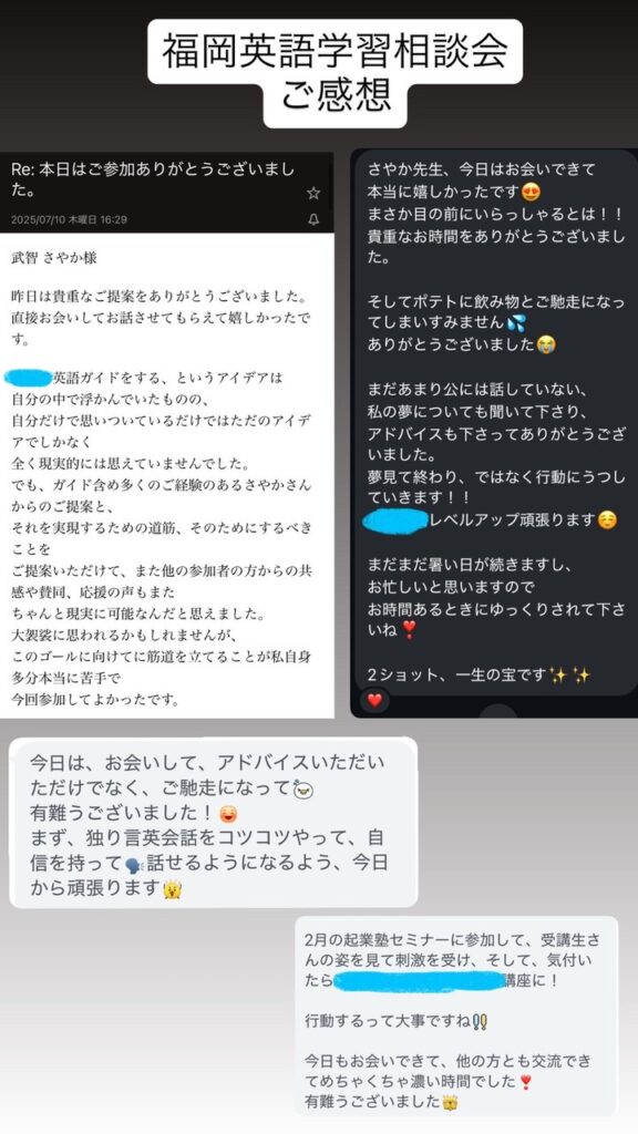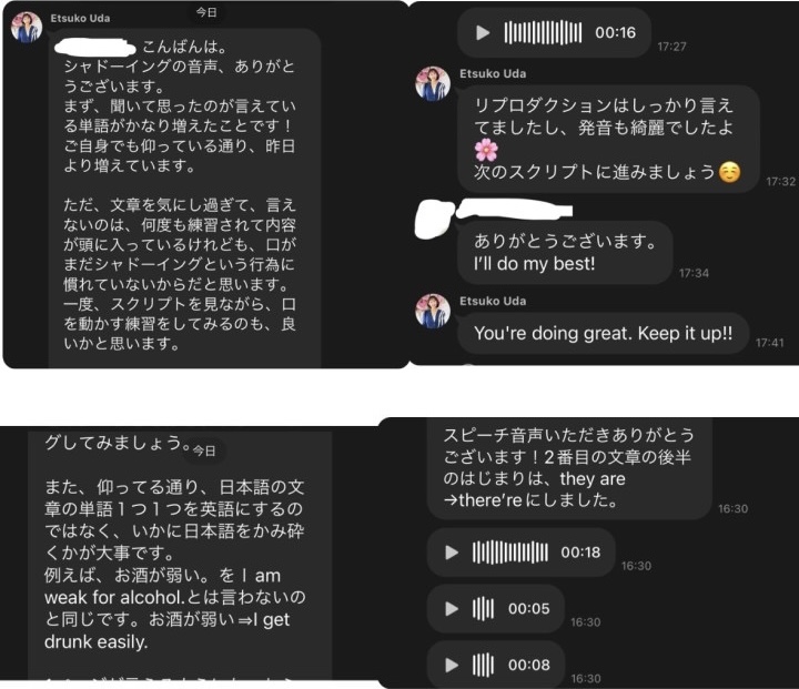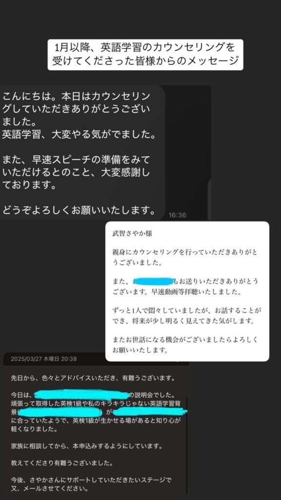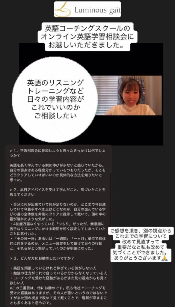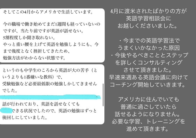 今までどんなことをしても英語学習が続けられなかったので、今回も本当にできるかどうか不安だったのですが、毎日報告し、アドバイスいただくという課程があるため続けてできるようになりました。自分が言いたいことが英語で出てくるスピードも早くなりびっくりしています。
