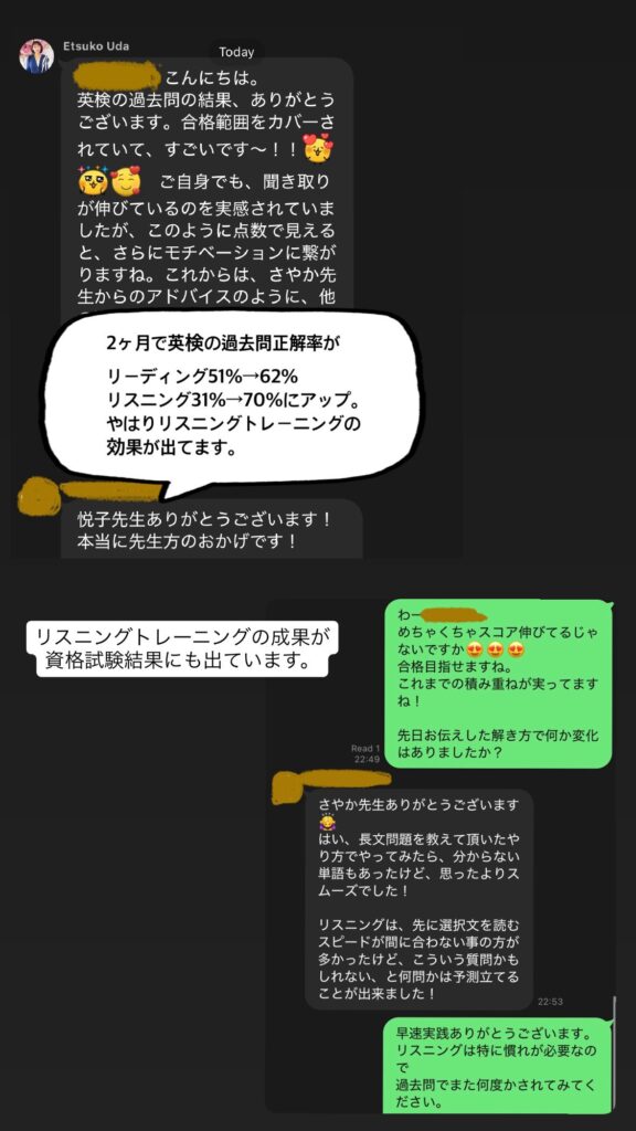 もし自分一人で英検準1級を目指していたら、途中でやめてしまうか、合格までにもっと時間がかかっていたと思います。 定期的に先生がメールで進捗状況を確認してくれることで毎日英語を勉強する習慣がついたこと。そしてれセッションを重ねるごとに、自分では気づかなかった英語力についての自分の強み、弱みを指摘してもらえたので、勉強方法を考える上で助けになりました。