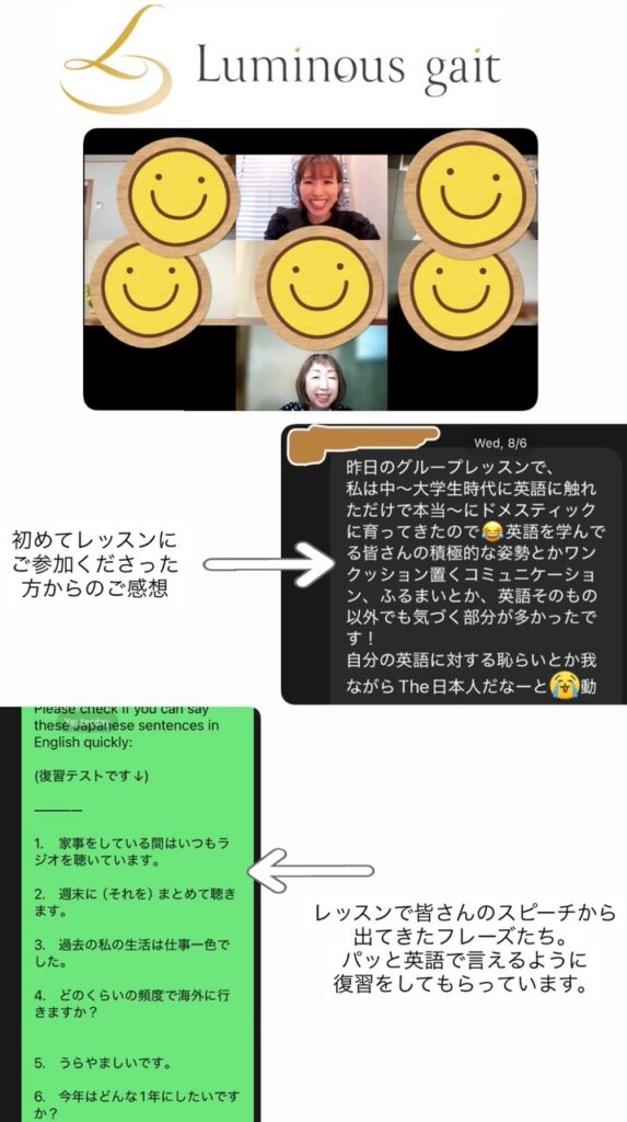 A、はい、初心者の方も学んでいただいています。最初は全く英語が聞き取れなかったという方も2ヶ月目にはネイティブの方の英語が理解できるようになり、3ヶ月後には通訳が必要なくなったという方もいらっしゃいます。私の主人も全くの初心者からのスタートでしたので、その学習ステップも個別相談会でお伝えさせていただきますね。 |
